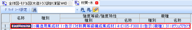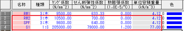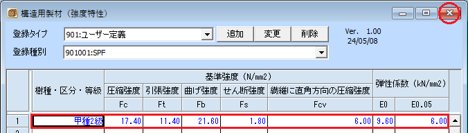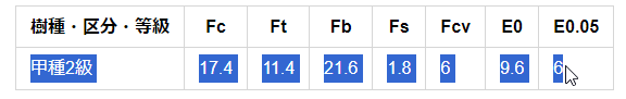 | 樹種・区分・等級 | Fc | Ft | Fb | Fs | Fcv | E0 | E0.05 |