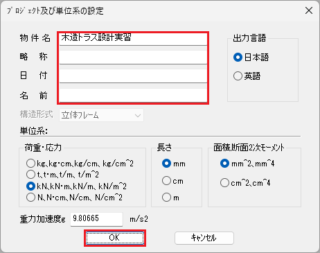 ダイアログを閉じた後は、[ファイル]→[プロジェクト概要、単位系]を選択して編集できます。