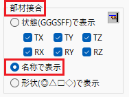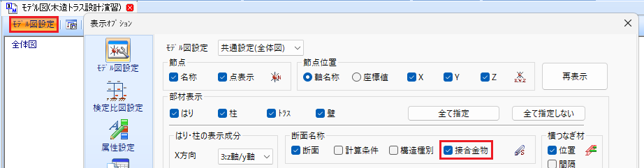 モデルウィンドウの[モデル図設定]ボタンをクリックして表示される[表示オプション]ダイアログで[断面名称]の[接合金物]にチェックを入れます。