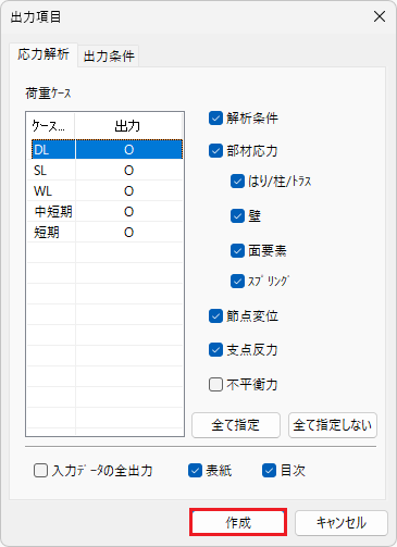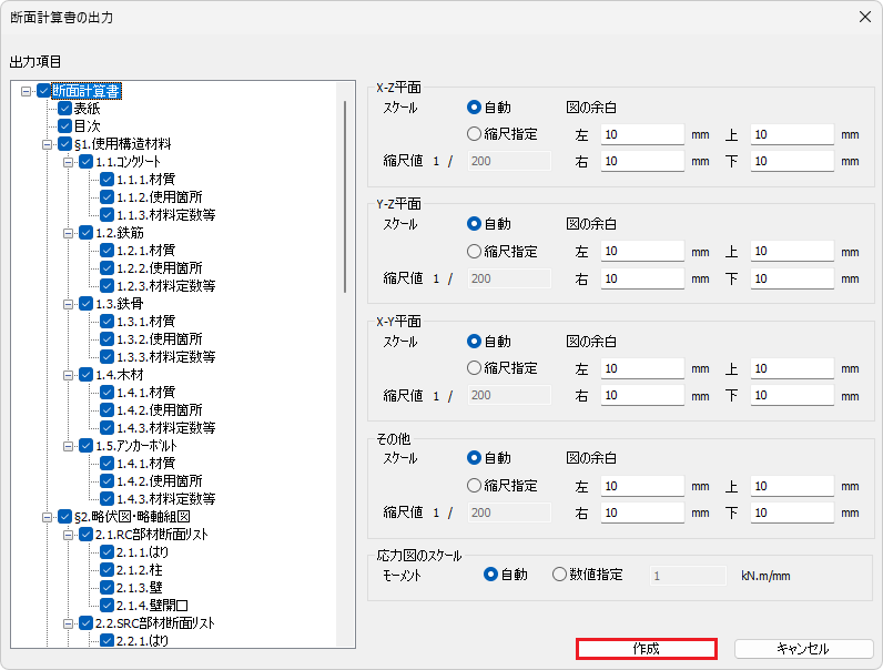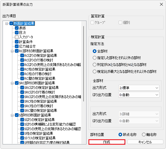 [断面計算書の出力]ダイアログの[作成]ボタンをクリックします。