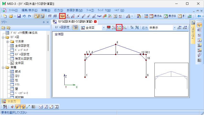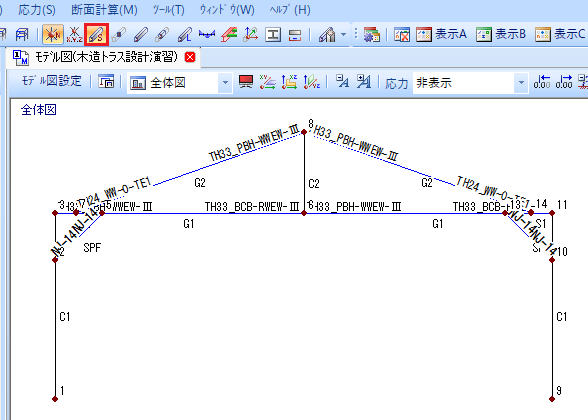 扱うトラスの形状は左右対称なので、片側の節点や部材などを配置した後に複写して架構を作成します。
