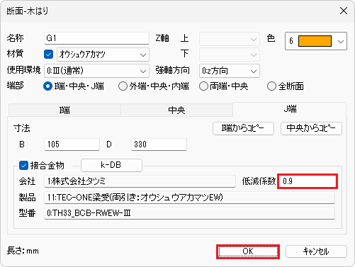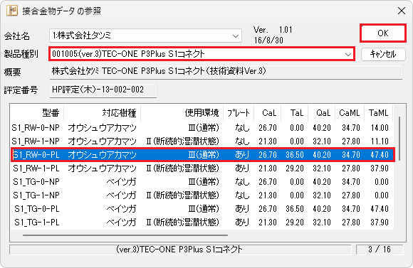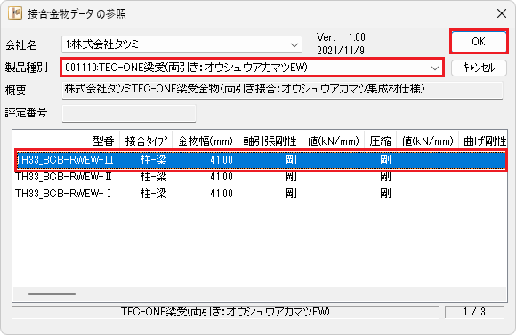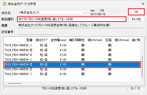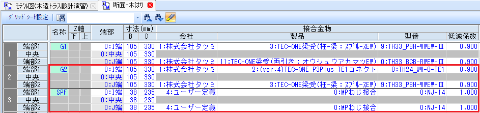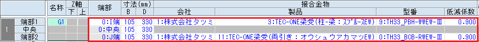 | 2 | G2 | 1:株式会社タツミ | 001008:(ver.4)TEC-ONE P3PlusTE1コネクト | TH24_WW-0-TE1 | 0.9 | 001101:TEC-ONE梁受(柱-梁: スプ ルースEW) | TH33_PBH-WWEW-Ⅲ | 0.9 |