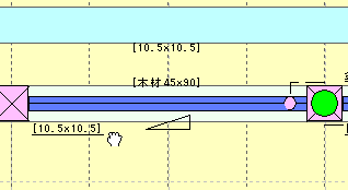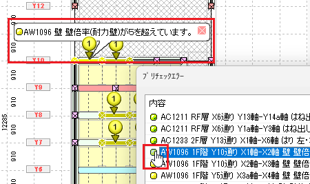 作業ウィンドウ上でメッセージ箇所が確認できる内容の場合、[プリチェックエラー]ダイアログのメッセージアイコンにマウスを移動するとマウスカーソルが変わります。その状態でクリックすると該当する部材にメッセージウィンドウを表示します。