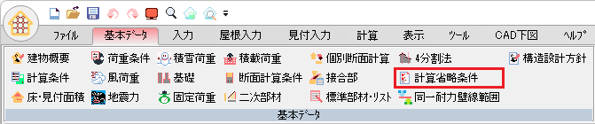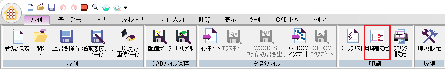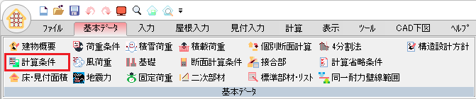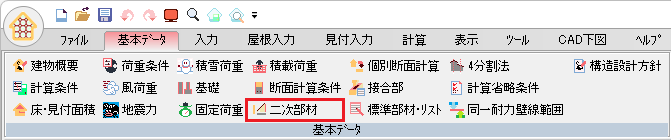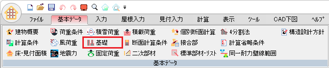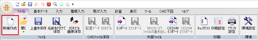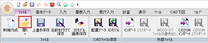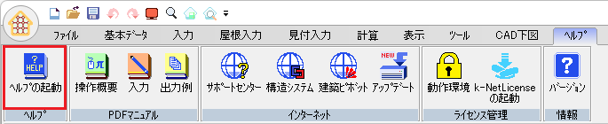 [ファイル][基本データ][入力]など関連する項目ごとにメニューで分かれて表示されます。各メニューをクリックすると、コマンドを選択するパネルが表示されます。パネル内のアイコンにカーソルを合わせクリックすると、コマンドを実行します。また、リボン表示は最小化することができます(詳細は、HOUSE-ST1ヘルプ「リボンメニューについて」を参照して下さい)。