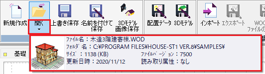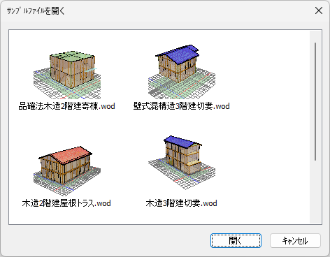 [開く]ダイアログの[サンプルファイルを開く]ボタンをクリックすると[サンプルファイルを開く]ダイアログが表示され、HOUSE-ST1のサンプルファイルを開くことができます。