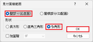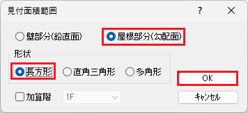 作業ウィンドウ内で1回右クリックすると[見付面積範囲]ダイアログが表示されます。[見付面積範囲]ダイアログの[キャンセル]ボタンをクリックしてもコマンドを終了できます。