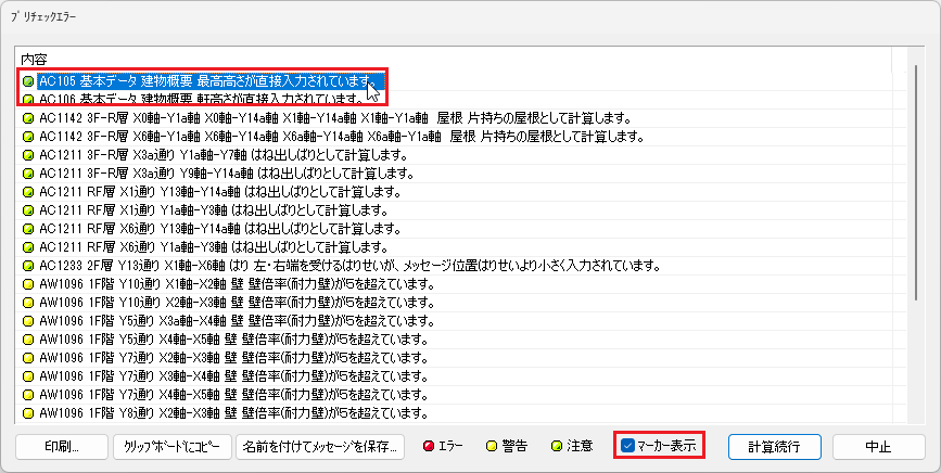 - [マーカー表示]に✓を入れると、作業ウィンドウ上のNG部材にマーカーが表示されます。