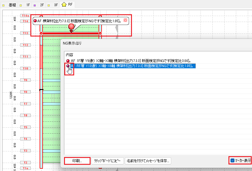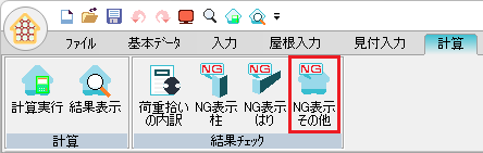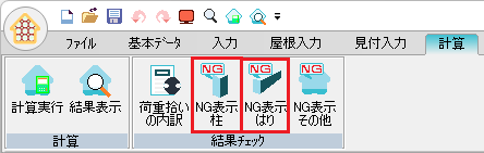 計算結果がNGとなる柱頭柱脚接合部、布基礎、基礎ばり、アンカーボルトとメッセージを確認することができます。