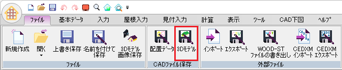※3Dモデルサブウィンドウに表示されている3DモデルをCADファイルとして保存することができます(詳細は、HOUSE-ST1ヘルプ「3DモデルをCADファイルに保存」を参照して下さい)。