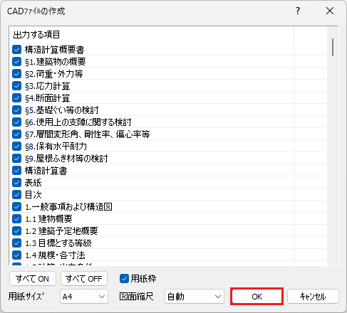 CADファイルを作成したい項目をチェックし、[OK]ボタンをクリックします。