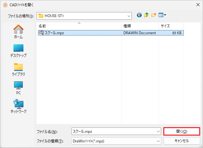 下図にするファイルを選択し、[開く]ボタンをクリックします(スクールではスクール.mpz を選択します)。