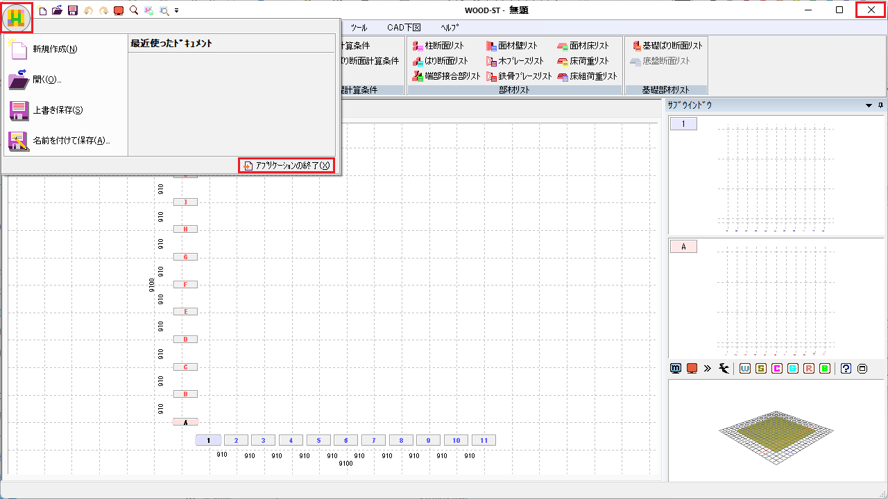 ※[WOOD-STボタン]をクリックし、[アプリケーションの終了]を選択しても終了できます。