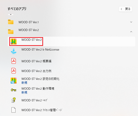 ※画面下部中央または左端の[スタート]ボタンをクリックし、[すべてのアプリ]→[WOOD-ST Ver.2]→[WOOD-ST Ver.2]からも起動できます。