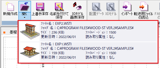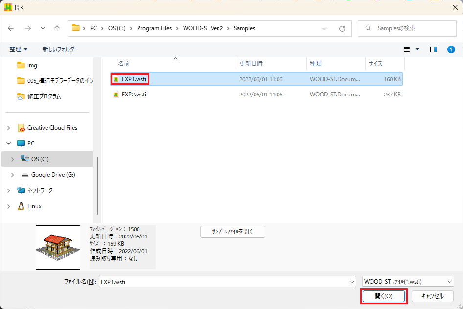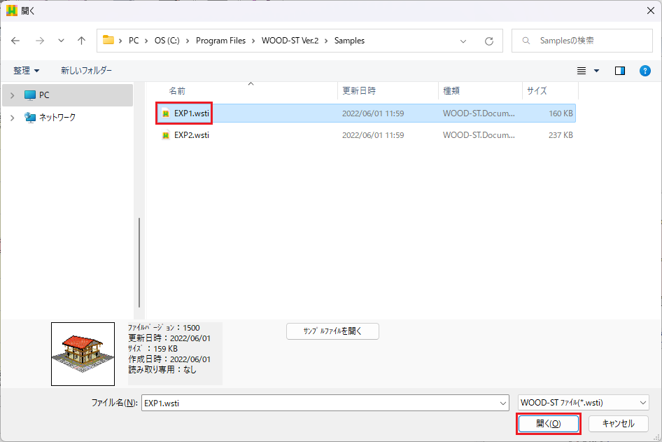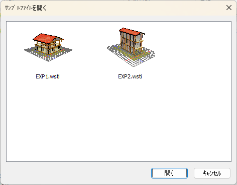 [開く]ダイアログの[サンプルファイルを開く]ボタンをクリックすると[サンプルファイルを開く]ダイアログが表示され、WOOD-STのサンプルファイルを開くことができます。