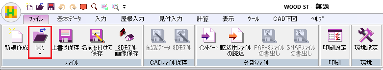 [新規作成][開く]など、よく使うコマンドが配置されています。アイコンにカーソルを合わせクリックしてコマンドを実行します。クイックアクセスツールバーは、使いやすいようにカスタマイズができます(詳細は、WOOD-STヘルプ「クイックアクセスツールバー」を参照して下さい)。
