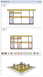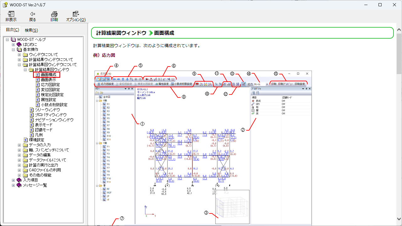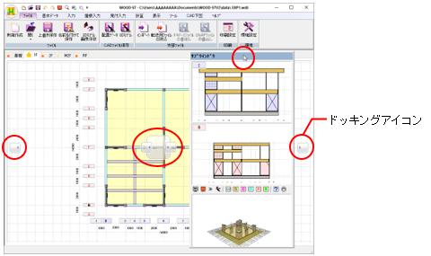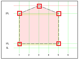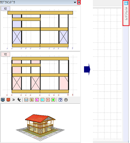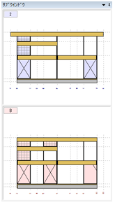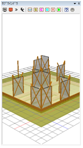 作業ウィンドウとは、平面部材(はり、柱、基礎など)、小屋組部材(小屋ばり、屋根など)、見付面積範囲を配置し、伏図、小屋伏図、見付面積図を書き込む作業エリアです。