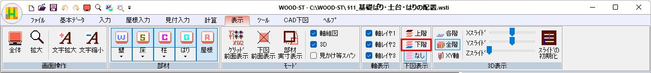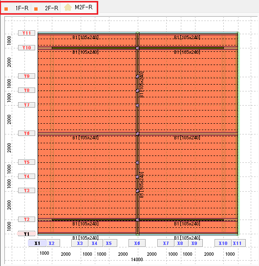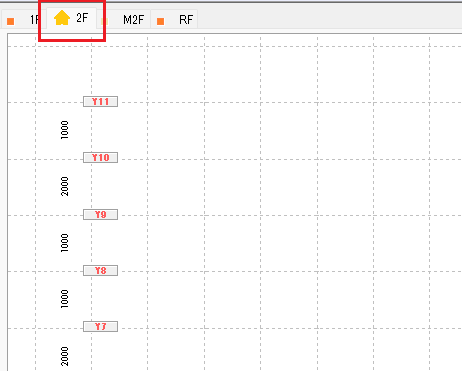 伏図、小屋伏図では、表示階(層)タブをクリックし、作業ウィンドウに表示する階(層)を選択できます。
