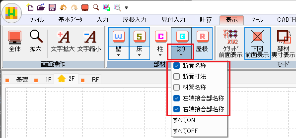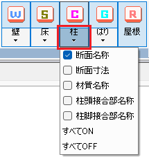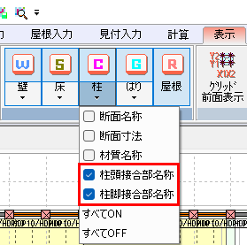 [表示]メニューの[柱]のボタン下部をクリックして[柱頭接合部名称][柱脚接合部名称]に✓を入れると、接合部名称を表示できます。