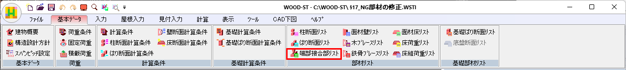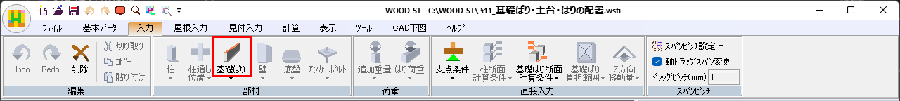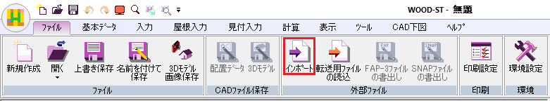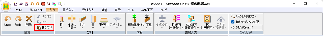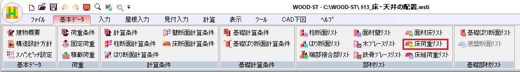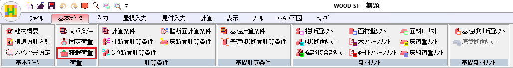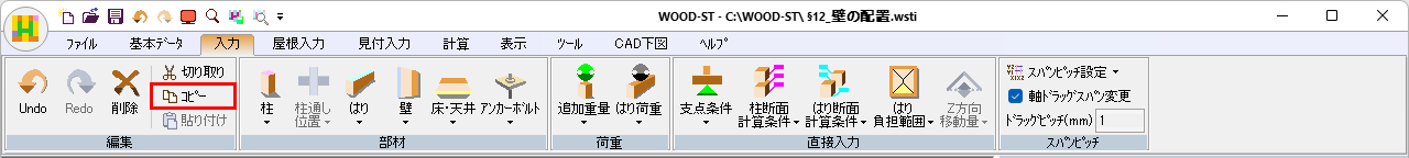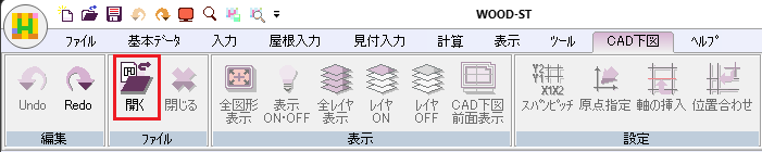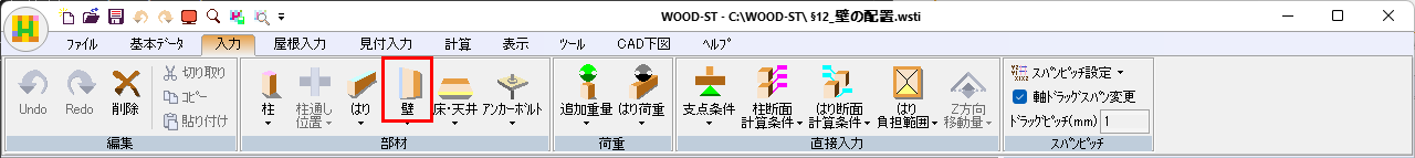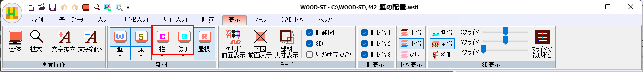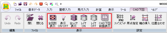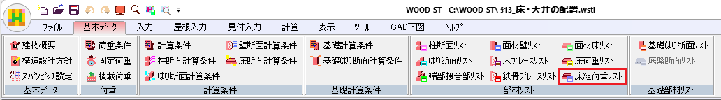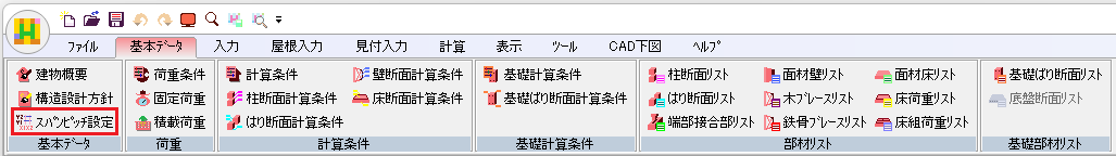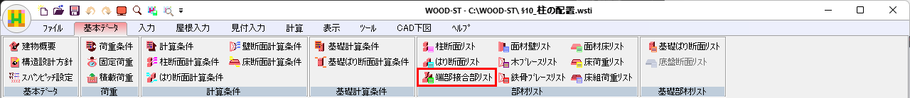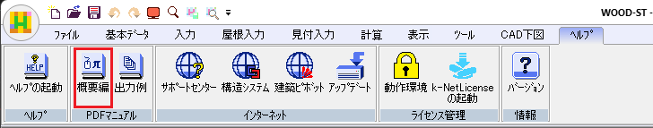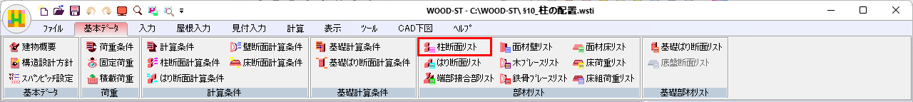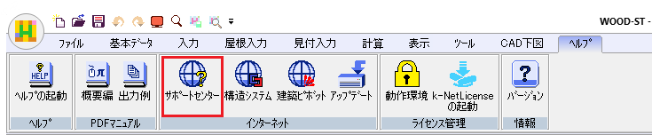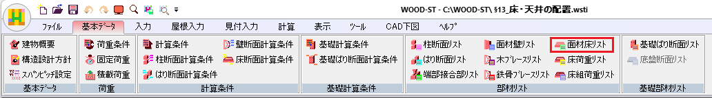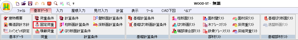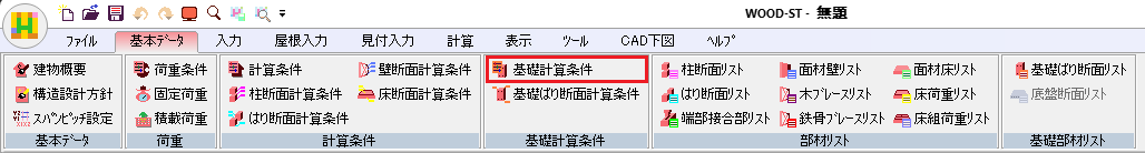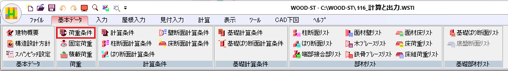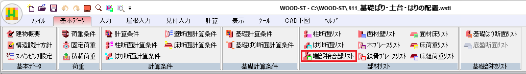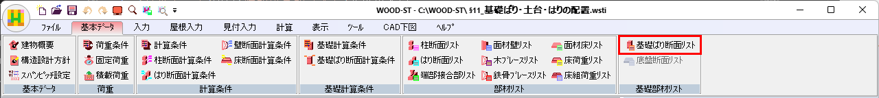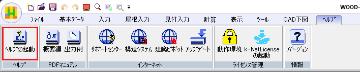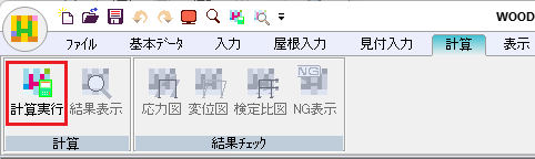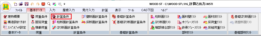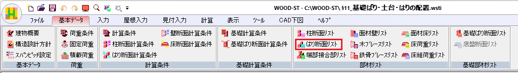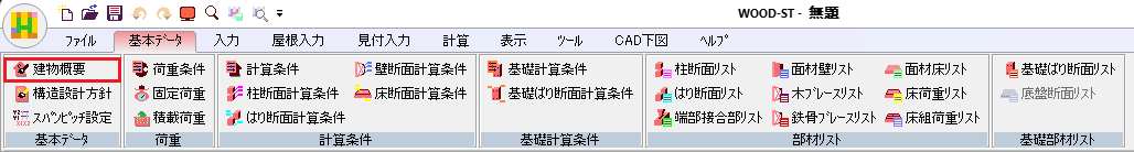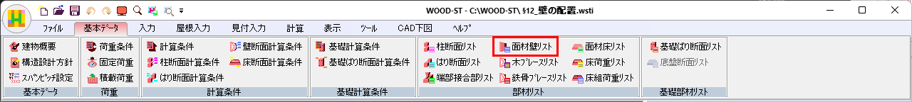 [ファイル][基本データ][入力]など関連する項目ごとにメニューで分かれて表示されます。各メニューをクリックすると、コマンドを選択するパネルが表示されます。パネル内のアイコンにカーソルを合わせクリックすると、コマンドを実行します。また、リボン表示は最小化できます(詳細は、WOOD-STヘルプ「リボンメニュー」を参照して下さい)。