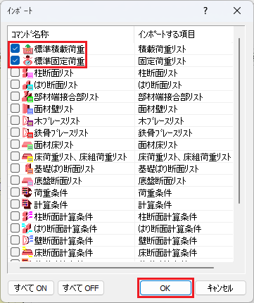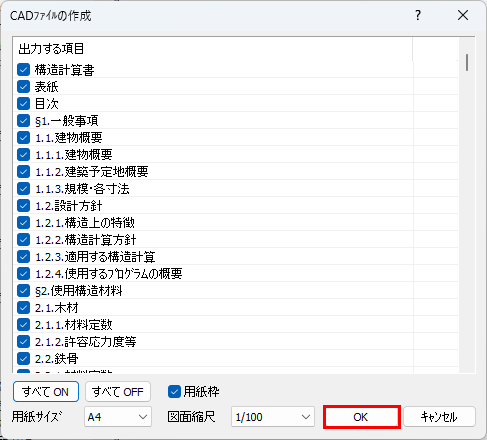 CADファイルを作成したい項目をチェックし、[OK]ボタンをクリックします。