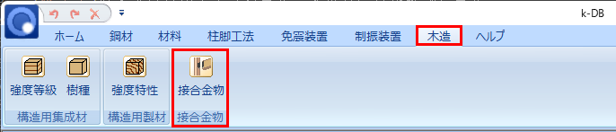 [k-DB]が起動します。[木造]メニューの[接合金物]を選択します。